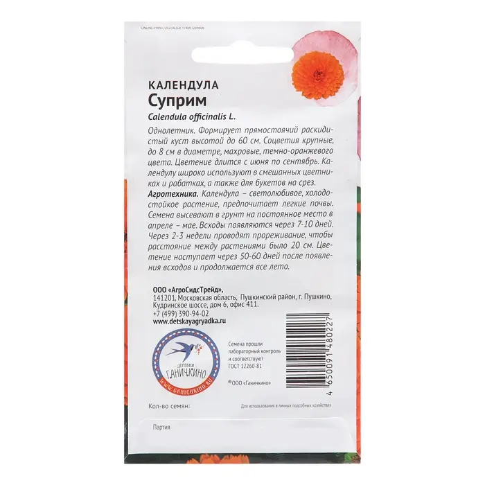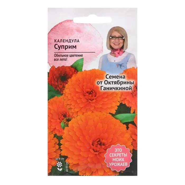 Однолетник. Формирует прямостоячий, раскидистый куст высотой до 60 см. Соцветия крупные, до 8 см в диаметре, махровые, темно-оранжевого цвета. Цветение длится с июня по сентябрь. Календулу широко используют в смешанных цветниках и рабатках, а также для букетов на срез. Агротехника: Календула – светолюбивое, холодостойкое растение, предпочитает легкие почвы. Семена высевают в грунт на постоянное место в апреле – мае. Всходы появляются через 7-10 дней. Через 2 – 3 недели проводят прореживание, чтобы расстояние между растениями было 20 см. Цветение наступает через 50-60 дней после появления всходов и продолжается все лето. Штрих-код - 4650091480227