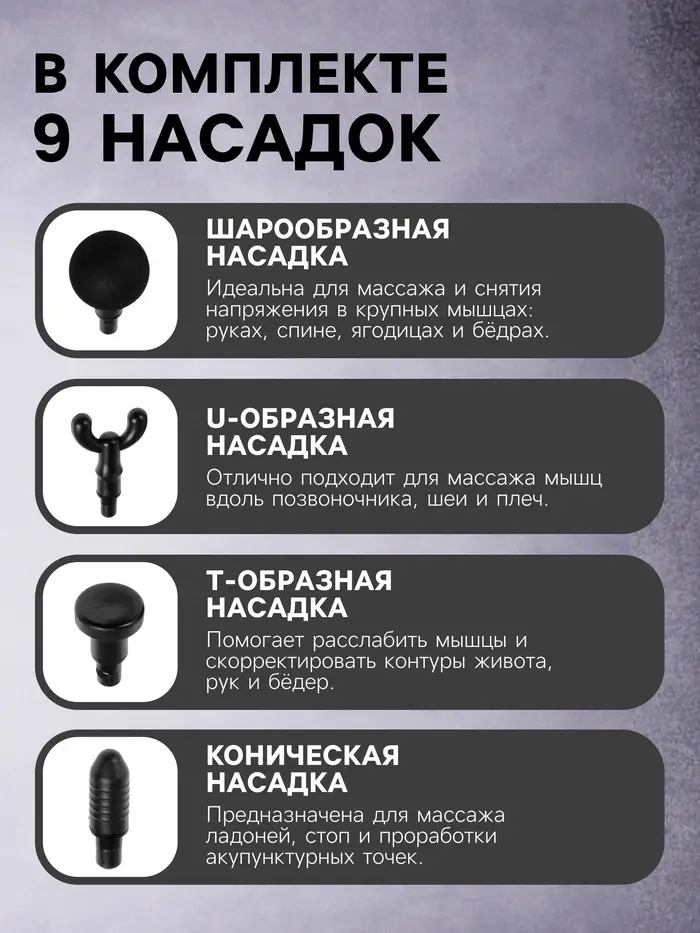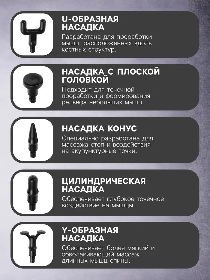 - Глубокий точечный массаж — коническая насадка предназначена для проработки триггерных точек, уплотнений и глубоких мышечных слоёв.