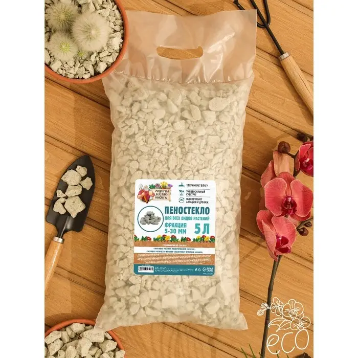 - Дренаж для растений: Насыпать пеностекло на дно горшка, либо грядки слоем 3-5 см в зависимости от размера ёмкости, сверху присыпать грунтом. Затем посадить растение.