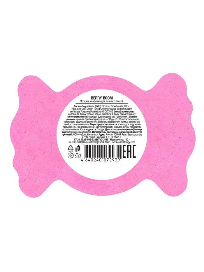 Ягодная конфетка для ванны с пенкой «Berry Boom» FABRIK Cosmetology, 100 г — это маленький праздник в вашей ванной. При соприкосновении с водой конфетка бурлит, создавая нежную пену, наполняет ванную ароматом сочной клубники и превращает купание в весёлое и ароматное приключение. «Berry Boom» подарит радость, положительные эмоции и сладкий ягодный аромат.