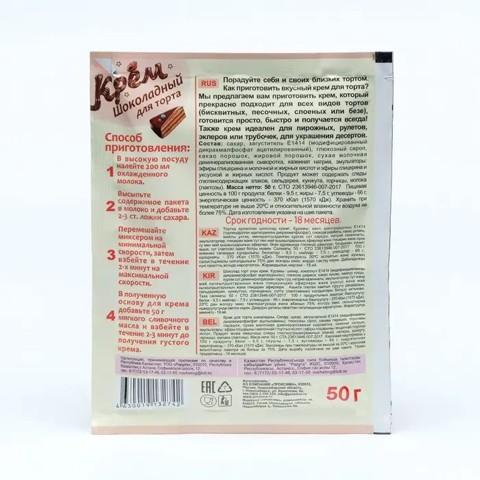 Состав: сахар, глюкозный сироп, сухая молочная деминерализованная сыворотка, жировой порошок, загуститель Е1414 (модифицированный дикрахмалфосфат ацетилированный), какао порошок, эмульгаторы: эфиры глицерина и молочной и жирных кислот и эфиры глицерина и уксусной и жирных кислот, казеинат натрия.