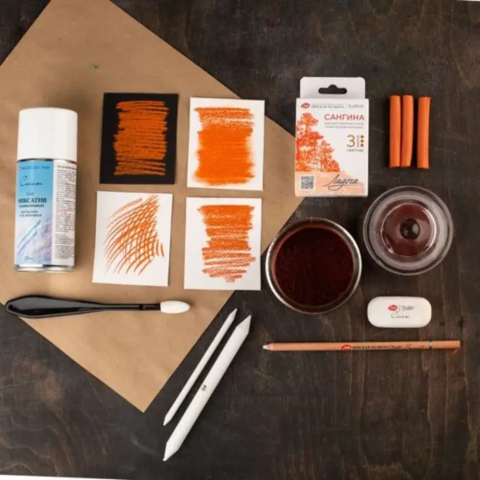 Сухой художественный материал сангина светлая предназначен для выполнения графических работ на бумаге, крафте, тонированной бумаге. Сангина наносится штриховкой и легко растушёвывается по поверхности бумаги. Для внесения исправлений в рисунок сангина удаляется с поверхности бумаги стирательной резинкой, формопластом или клячкой. Для долговечного хранения завершенные работы требуют дополнительного закрепления лаком фиксативом. Длина стержня - 65 мм. Диаметр - 10 мм. Состав сангины: наполнитель, пигмент, добавки. Гарантийный срок - 5 лет с даты изготовления. Хранить в сухом закрытом помещении, при температуре от 0 °С до 40 °С и относительной влажности воздуха не выше 60 %. Комплектация набора: сангина светлая 3 мелка, поролоновый ложемент, поролоновый защитный слой, картонная коробка с европодвесом. Производство ЗХК "Невская палитра".