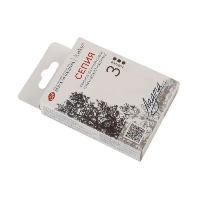 Сухой художественный материал сепия предназначен для выполнения графических работ на бумаге, крафте, тонированной бумаге. Сепия наносится штриховкой и легко растушёвывается по поверхности бумаги. Для внесения исправлений в рисунок сепия удаляется с поверхности бумаги стирательной резинкой, формопластом или клячкой. Для долговечного хранения завершенные работы требуют дополнительного закрепления лаком фиксативом. Длина стержня - 65 мм. Диаметр - 10 мм. Состав сепии: наполнитель, пигмент, добавки. Гарантийный срок - 5 лет с даты изготовления. Хранить в сухом закрытом помещении, при температуре от 0 °С до 40 °С и относительной влажности воздуха не выше 60 %. Комплектация набора: сепия 3 мелка, поролоновый ложемент, поролоновый защитный слой, картонная коробка с европодвесом. Производство ЗХК "Невская палитра".