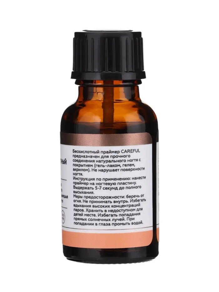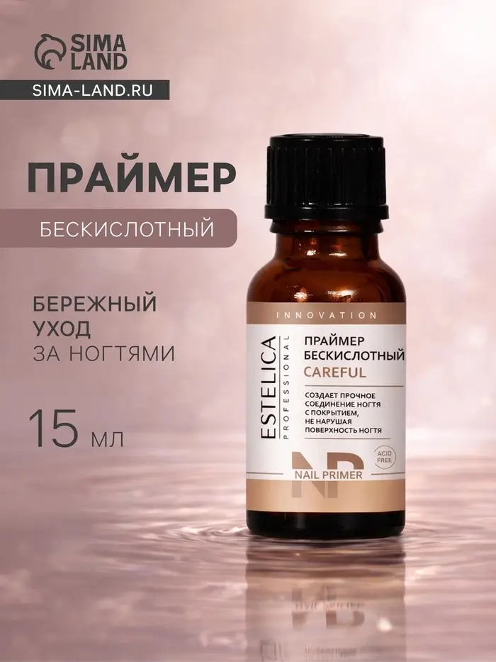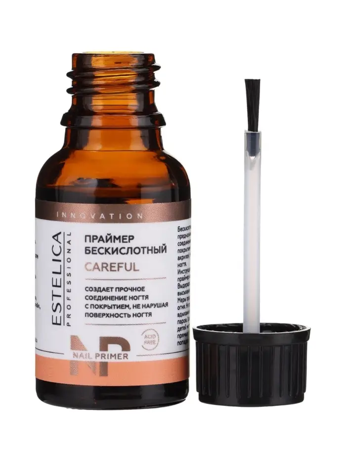 ESTELICA PROFESSIONAL CAREFUL, бескислотный праймер 15 мл — профессиональное средство для усиления адгезии и надёжного соединения ногтевой пластины с искусственными материалами, такими как гель-лак, гель или акрил. Праймер создаёт тонкую защитную пленку на поверхности ногтя, которая обеспечивает прочное сцепление и предотвращает образование сколов и отслоений.