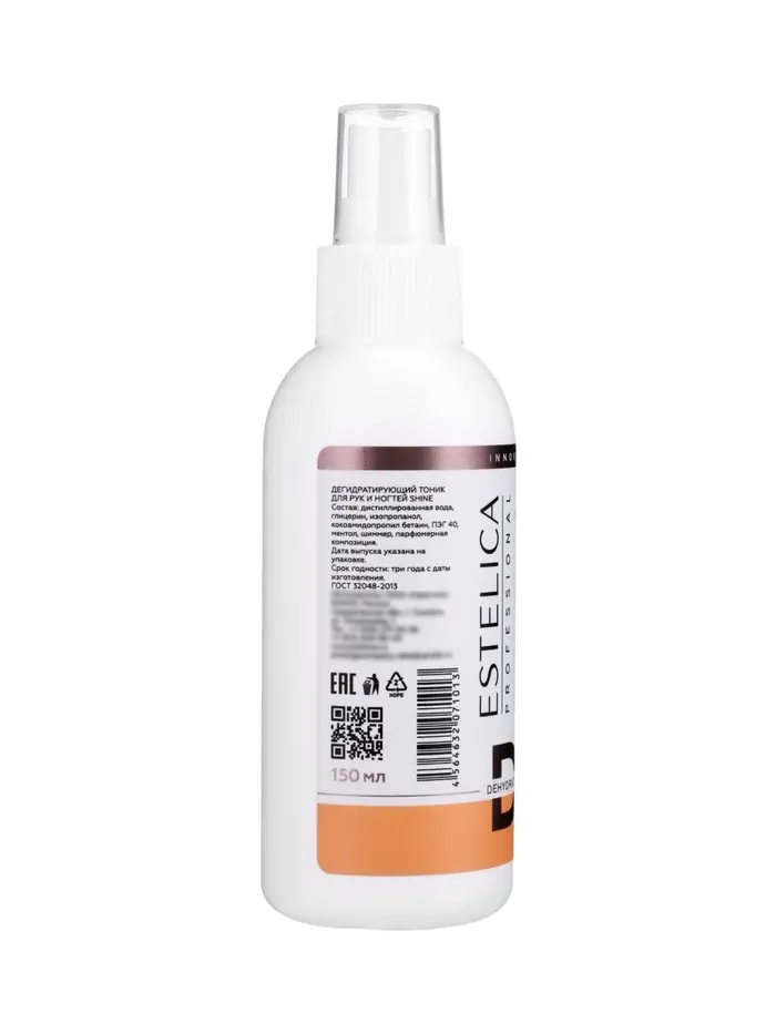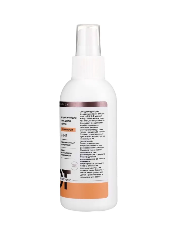 ESTELICA PROFESSIONAL SHINE, дегидратирующий и очищающий тоник для рук и ногтей 150 мл (спрей) — средство для эффективного удаления влаги с поверхности кожи без пересушивания, оказывающее мягкое очищающее и антибактериальное действие. Мелкие частицы шиммера придают коже лёгкое мерцающее сияние, создавая эффект здорового сияния, и делают средство идеальным для подготовки рук к фото- и видеосъёмке. Рекомендуется использовать до и после маникюра.