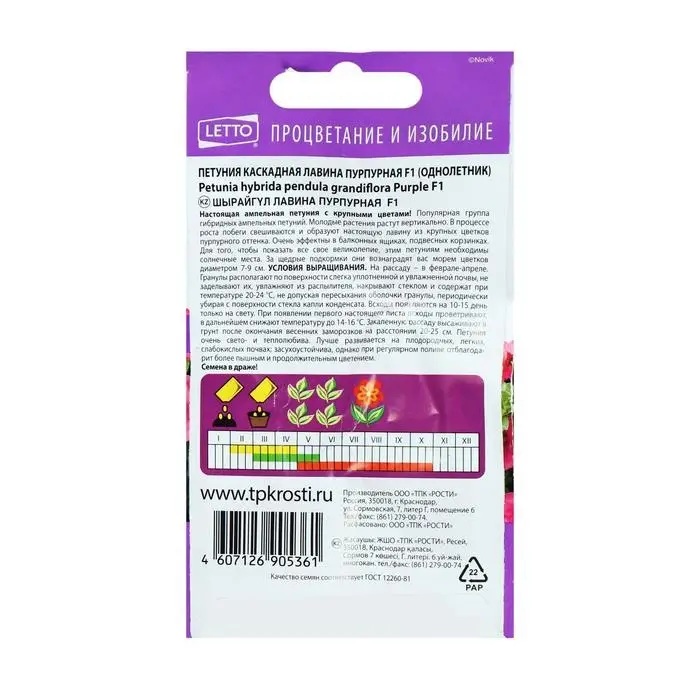 Посев: на рассаду под стекло — февраль-апрель. Каждое семечко покрыто специальным легкорастворимым составом для облегчения посева и выращивания. Семена располагают по поверхности слегка уплотнённой и увлажнённой почвы и увлажняют из распылителя.