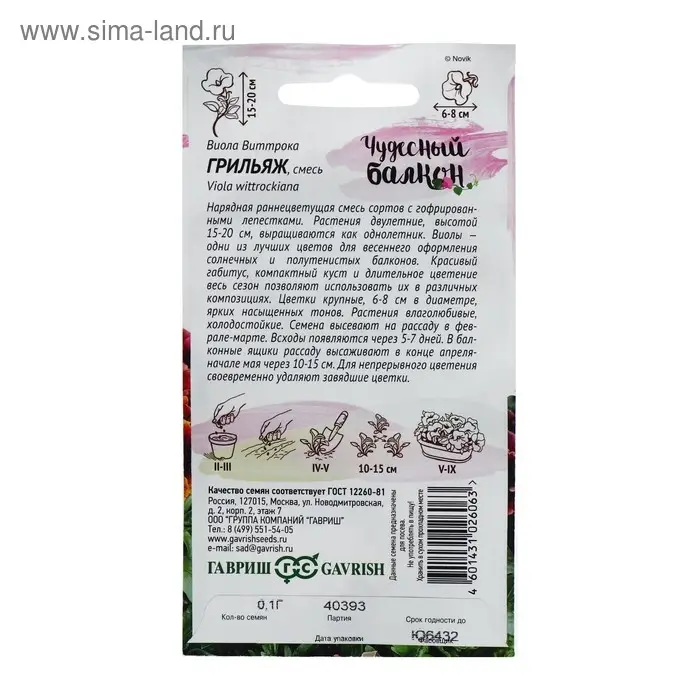 Нарядная раннецветущая смесь сортов с гофрированными лепестками. Растения двулетние, высотой 15-20 см, выращиваются как однолетник. Виолы- одни из лучших цветов для весеннего оформления солнечных и полутенистых балконов. Красивый габитус, компактный куст и длительное цветение весь сезон позволяют их использовать в различных композициях. Цветки крупные, 6-8 см в диаметре, ярких насыщенных тонов. Растения влаголюбивые, холодостойкие. Семена высевают на рассаду в феврале-марте. Всходы появляются через 5-7 дней. В балконные ящики рассаду высаживают в конце апреля-начале мая через 10-15 см. Для непрерывного цветения своевременно удаляют завядшие цветки.