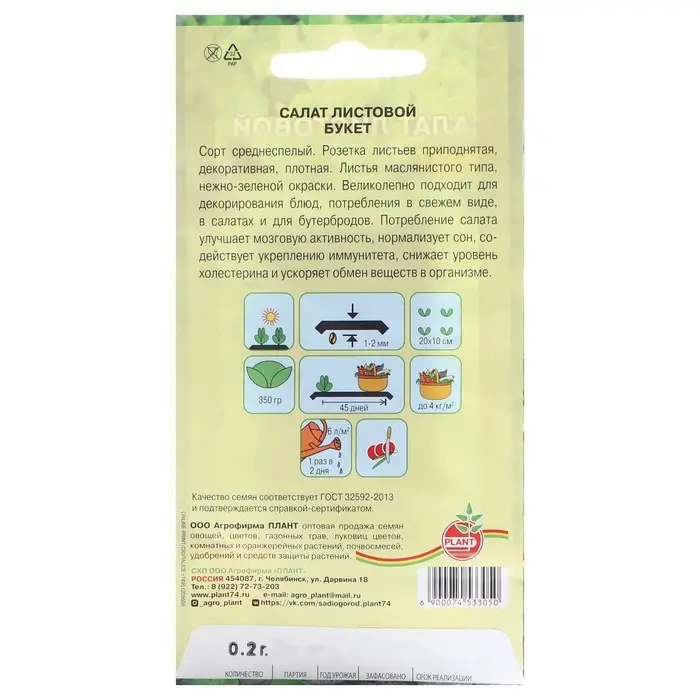 Среднеспелый сорт, созреет за 40-50 дней. Длина листьев до 30 см, розетка в диаметре 30 см. Великолепно подойдет для салатов и сэндвичей. Посев в открытый грунт с марта по июль, в августе для молодых всходов. В подготовленный грунт сейте редко с интервалом 15-25 см. Присыпьте грунтом. Регулярно поливайте.