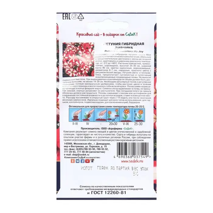 Растение компактное, прямостоячее, шаровидное, высотой 25-30 см, шириной куста 40 см. Цветки одиночные, воронковидные, диаметром 6-7 см, нарядные, красного цвета с рисунком белой звезды. Петуния свето- и теплолюбива, предпочитает суглинистые и супесчаные водопроницаемые плодородные почвы. Не выносит сырых и кислых почв. При выращивании в контейнерах их объём должен быть достаточно большим, не менее 14-20 см. Необходим регулярный полив и регулярные подкормки полным минеральным удобрением, чтобы растение цвело в течение всего теплого периода и могло показать себя во всей красе.