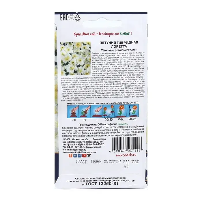 Посев семян на рассаду проводят в конце февраля-марте. Семена слегка вдавливают в почву, не присыпая землей, хорошо увлажняют из распылителя. При попадании влаги на гранулу оболочка должна раствориться. Посевы накрывают стеклом или целлофаном для сохранения постоянной влажности и до полных всходов, ставят в освещенное место. Рассаду высаживают в открытый грунт через 7-9 недель или после окончания весенних заморозков. Идеально подходит для всех типов использования: для горшков, контейнеров, подвесных корзин, для озеленения клумб, бордюров.