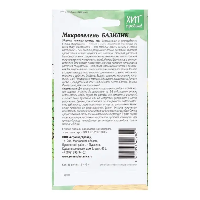 Семена на Микрозелень "Базилик", овощной, Микс, 5 г