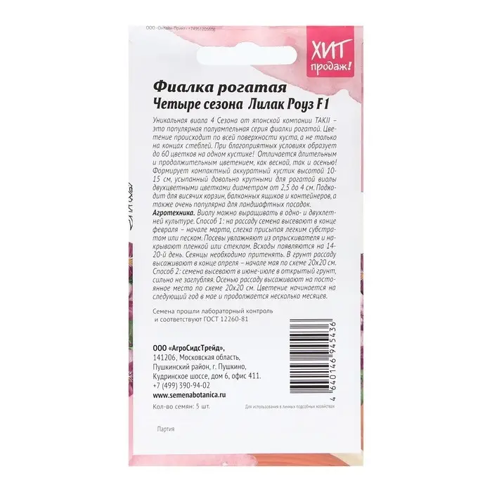 Семена цветов Агросидстрейд фиалка рогатая Четыре сезона Лилак Роуз F1 используются для высадки в миксбордеры. За счет контрастной окраски лавандового с белым цветов получаются оригинальные композиции. Характеризуются длительным и обильным цветением. Период — с апреля по июль. Высота фиалки — 10-15 см.