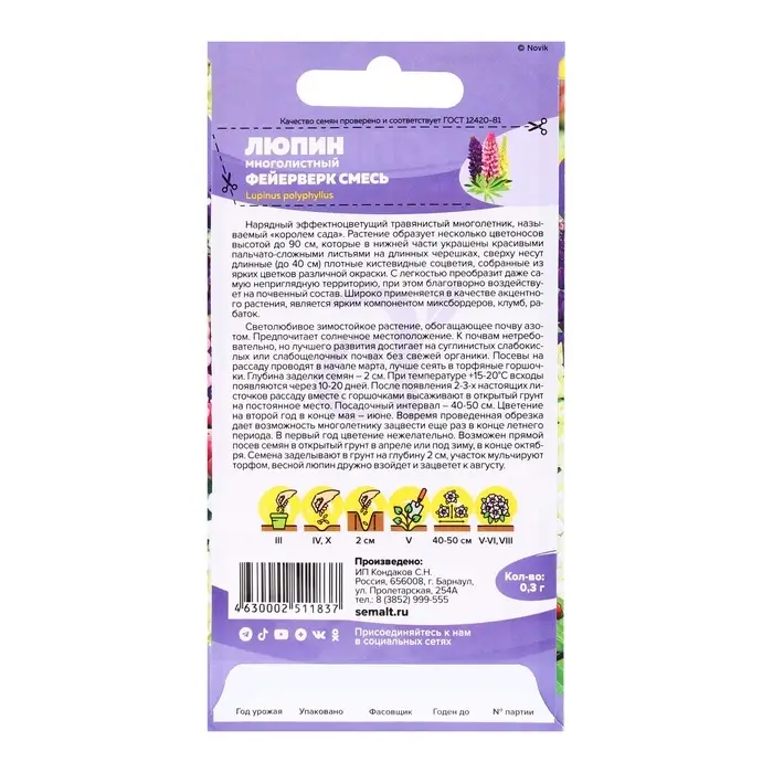 Люпин Фейерверк от производителя Семена Алтая. Это многолетнее травянистое растение семейства бобовых, которое вырастает в высоту до 90 см. Период цветения приходится на июнь, длится около 30 дней. Возможно повторное цветение в августе, если удалять старые соцветия. Цветки 2 см красного, белого, желтого, фиолетового, розового оттенка образуют соцветия формы кисти с приятным ароматом, длиной 40 см. Листья пальчатые на прямых сочных стеблях. В первый год цветение нежелательно. Этот сорт выращивают через посев в открытый грунт апреле-мае. Любит затемненные места, удобрения, обильное увлажнение, дренаж. Хорошо переносят холод.