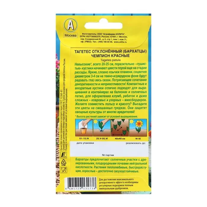"Невысокие, всего 20-25 см, поразительн «пушистые» кустики начинают цвести порой еще на стадии рассады. Яркие, словно язычки пламени соцветия диаметром 3-4 см на темно-изумрудном фоне будут радовать глаз весь сезон. Потрясающее сочетание декоративности и неприхотливости! Компактные и аккуратные кустики отлично подходят для выращивания в контейнерах на балконах и солнечных патио, для оформления клумб, рабаток и даже сложных – ковровых и узорных – миксбордеров. Желаете совместить пользу и красоту? Высадите эти цветы на смешанных грядках. Они защитят овощные культуры от многих вредителей!