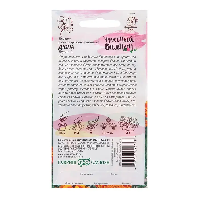 Семена Бархатцы "Дюна", ц/п, Тагетес, отклоненные, 0,3 г