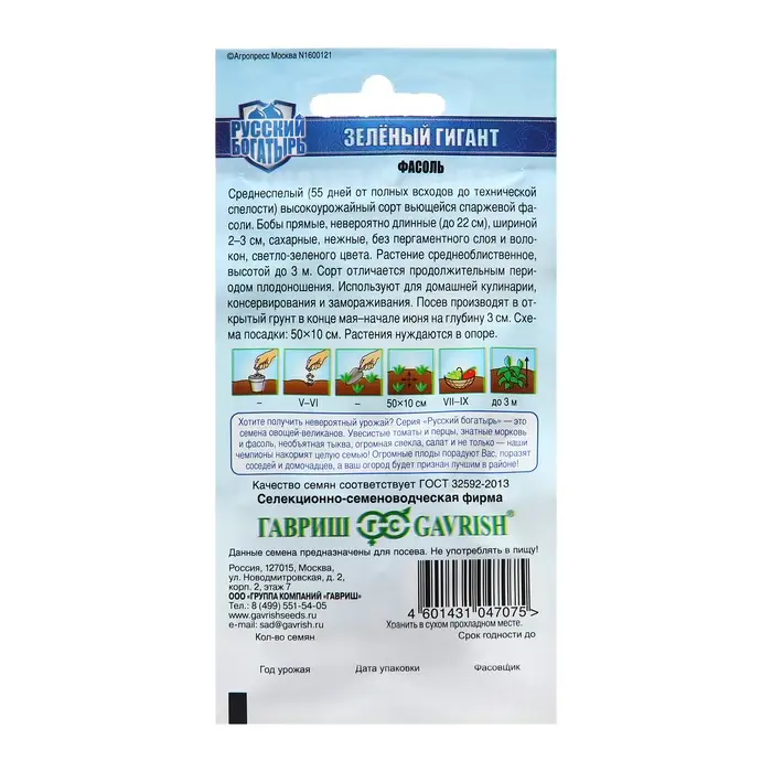 Семена Фасоль "Зеленый гигант", ц/п, 5,0 г