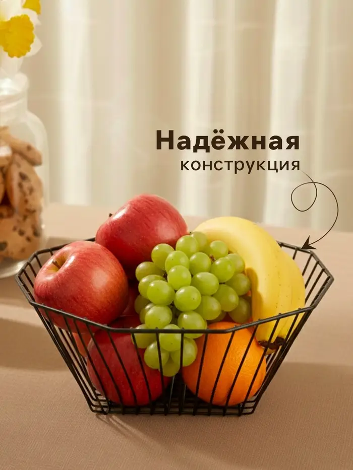 Фруктовая корзина «Квадраты» — лаконичный акцент для кухни или обеденной зоны. Её фигурная форма и насыщенный чёрный цвет подчёркивают современный дизайн, а открытая конструкция обеспечивает циркуляцию воздуха, продлевая свежесть фруктов. Этот предмет легко превращает повседневную нарезку в стильную композицию на столе.