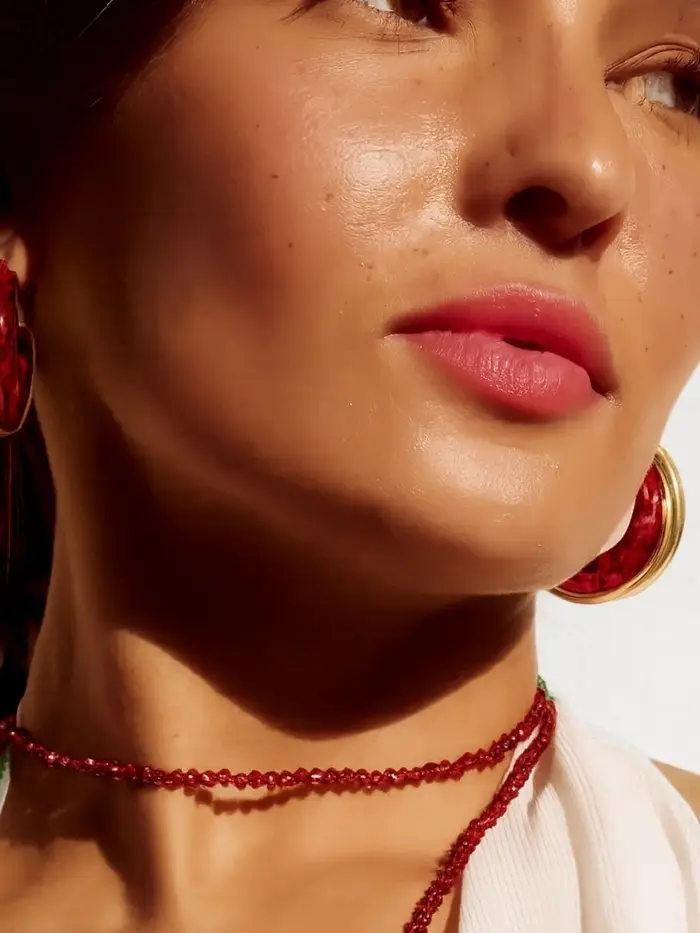 Золотистая рамка вокруг бордово-красного камня Серьги-кольца «Тренд» – изделие, сочетающее богатые оттенки красного с теплотой золотых металлических акцентов, создавая притягательное сочетание ярких цветов и классической элегантности.