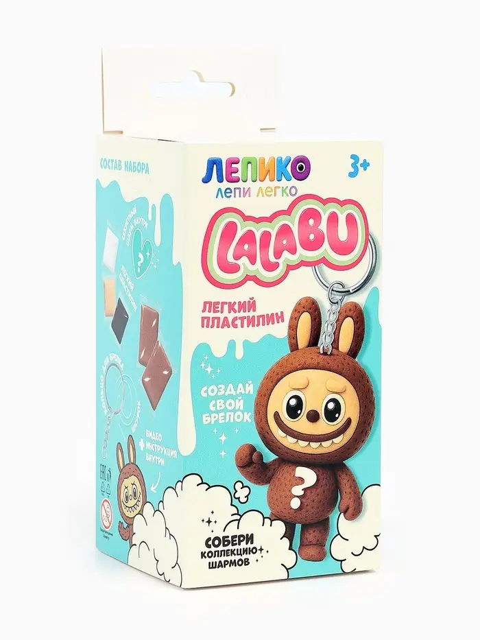 В наборе: легкий пластилин - 4 цвета; фурнитура (кольцо для брелока, шнурок); секретный шарм.