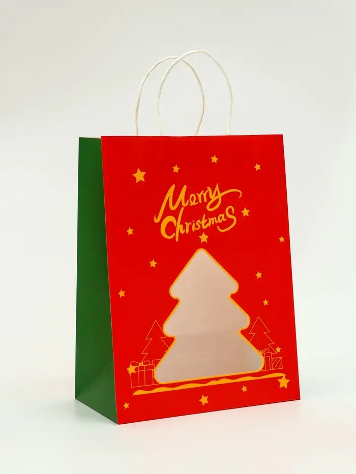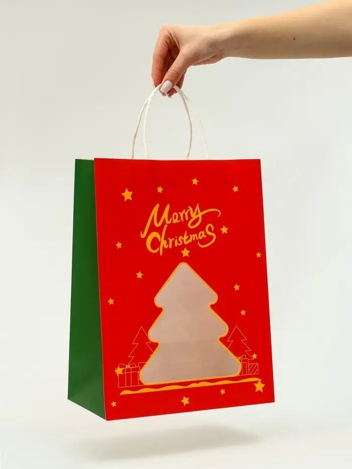 Пакет подарочный бумажный с окном «Ёлка» 26×35×16 см, крафт красный