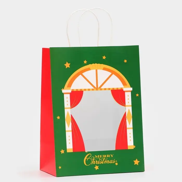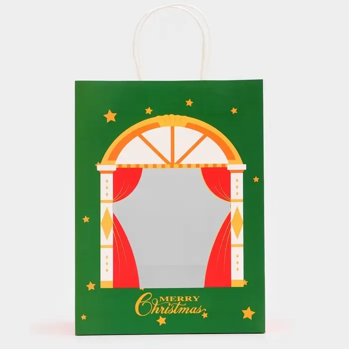 Пакет подарочный бумажный с окном «Театр» 30×22×14 см, крафт зеленый