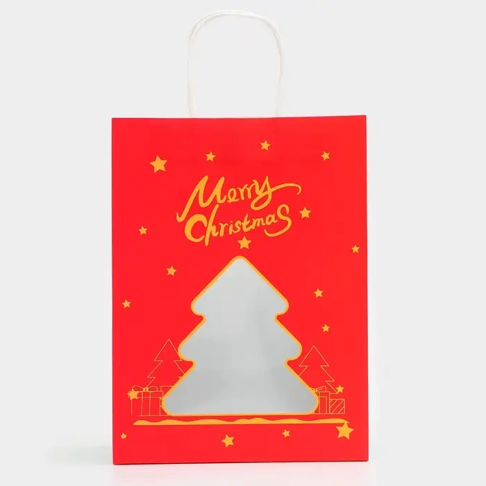 Пакет подарочный бумажный с окном «Ёлка» 30×22×14 см, крафт красный