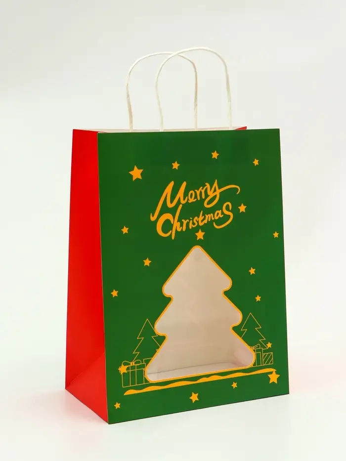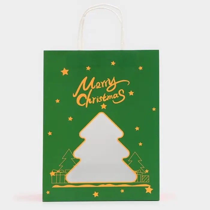 Пакет подарочный бумажный, с окном «Ёлка» 26×35×16 см, крафт зеленый