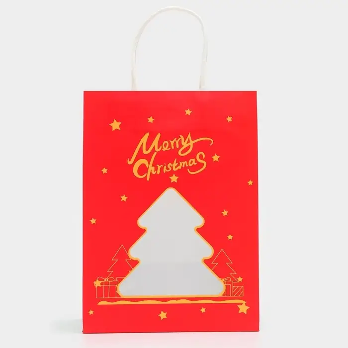 Пакет подарочный бумажный с окном «Ёлка» 19×26×13 см, крафт красный