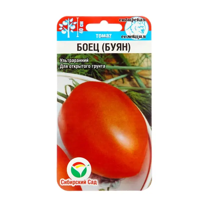 Томат Боец (Буян) - это ультраскороспелый сорт сибирской селекции для выращивания в открытом грунте. Плоды цилиндрические, плотные, гладкие, на 3-4 камеры, средней массой 90 г (первые – до 180 г), хорошо и быстро дозариваются. Обладают гладкой толстой кожицей. Семенные камеры, в среднем, не превышают 4-5 штук на один помидор, но количество семян в целом немного (5% от общей массы). Назначение универсальное – для свежего потребления и консервирования. Сорт отличается устойчивостью к засухе и хорошим иммунитетом к вирусным и бактериальным инфекциям томата. Не предназначен для долгого хранения в свежем виде.