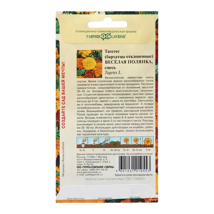Семена цветов Бархатцы тагетес отклоненные, «Веселая полянка», 0.3 г, «Гавриш»