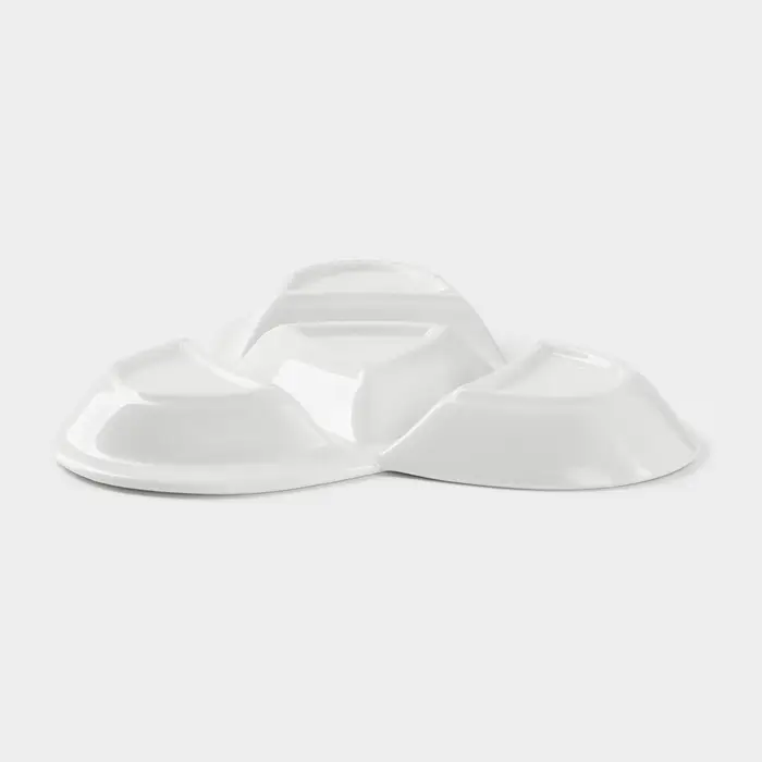 Керамическая тарелка с четырьмя секциями станет стильным аксессуаром для сервировки закусок, сыров или специй. Белоснежная поверхность подчеркивает лаконичность формы, а фигурный силуэт вдохновлен узором трикветр, добавляя посуде культурный акцент. Практичная ширина 21 см и компактная высота 2,5 см делают её удобной для хранения в шкафу или подачи на стол.