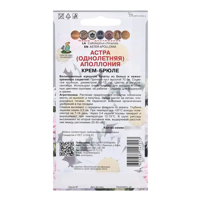 Великолепные изящные букеты из белых и нежно-кремовых соцветий! Прочный куст высотой 70 см. Соцветия крупные, диаметром 10-12 см. Цветет в августе-сентябре. Используют очень широко: для посадки в сборные цветники группами, на рабатки - рядами, для бордюров и срезки.Агротехника. Растение предпочитает открытое солнечное место, но выносит и полутень. Лучше растет на легких, плодородных почвах. Не переносит внесения органических удобрений в год посадки. Семена высевают с середины февраля по апрель. Глубина заделки семян 0,5 см. При температуре +20°C всходы появляются на 7-14 день. Через 3-4 недели посевы пикируют и выращивают при температуре 12-15°C. В грунт рассаду высаживают во второй половине мая, выдерживая расстояние между растениями 20-30 см.Семена соответствуют требованиям международных стандартов и ГОСТу РФ 12260-81