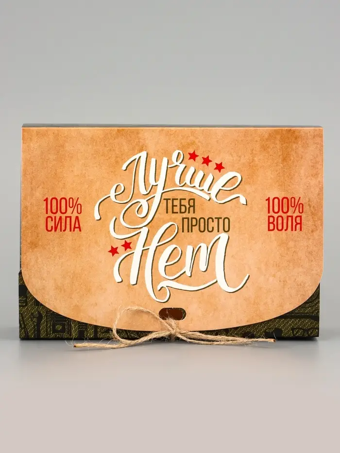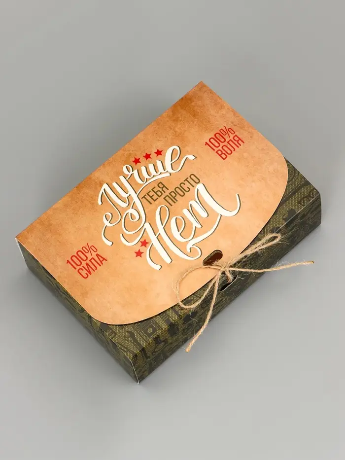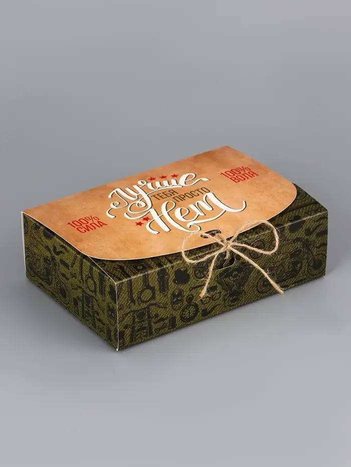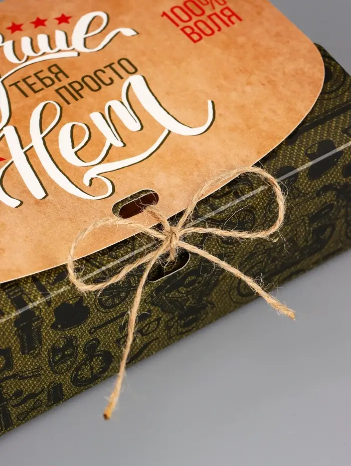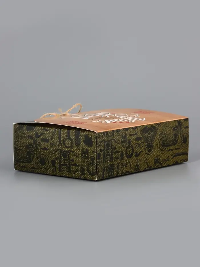 Сдержанный стиль для мужского подарка. Сборная коробка с тематическим дизайном «Мужская» — это лаконичная и практичная упаковка. Её дизайн без лишних деталей подходит для подарков на 23 февраля, день рождения или другой мужской праздник.