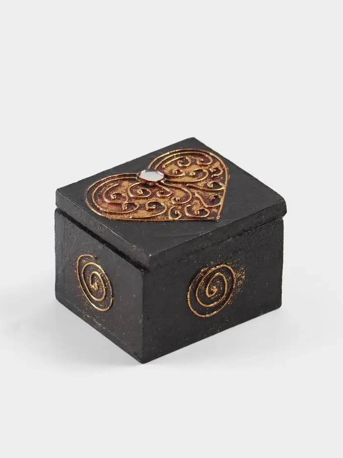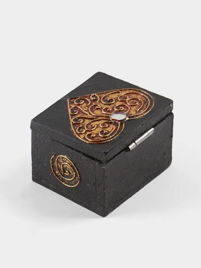 - Стильный дизайн с символом любви: Классическая прямоугольная форма, украшенная тематическим рисунком в виде сердечек, создаёт настроение нежности. Глубокий чёрный цвет и глянцевое покрытие придают шкатулке солидный и современный вид, который гармонично впишется в любой интерьер.
