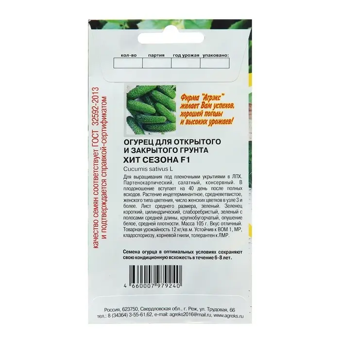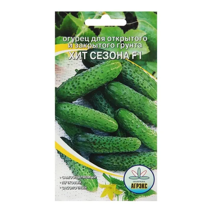 Огурец F1 Хит сезона - партенокарпический высокоурожайный скороспелый пучковый корнишонный гибрид универсального типа выращивания (для открытого грунта, тоннелей, весенних теплиц). НАДЕЖНЫЙ ГИБРИД — благодаря комплексной устойчивости к болезням и неблагоприятным условиям среды дает стабильно высокий урожай в любых условиях. Хорошее отрастание боковых побегов в сочетании со II типом саморегулирования ветвления обеспечивает длительное активное плодоношение до глубокой осени. В узлах формируется от 2-3 до 5-6 и более завязей. Зеленцы красивой ярко-зеленой окраски, белошипые, с плотной хрустящей мякотью, с часто-средним опушением, длиной 9-12 см; засолочные и вкусовые качества очень высокие. Теневынослив.