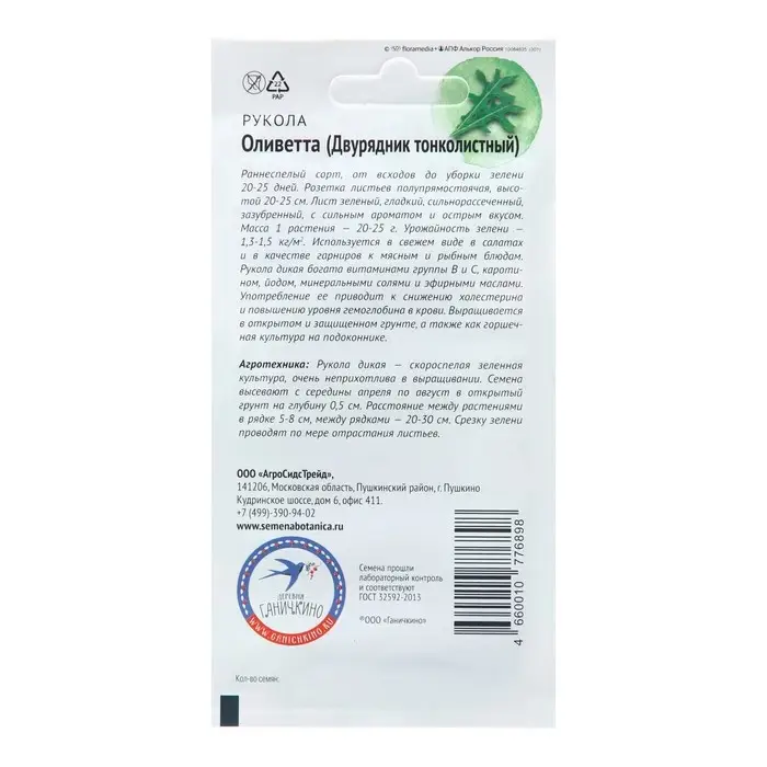 Раннеспелый сорт, от всходов до уборки зелени 20-25 дней. Розетка листьев полупрямостоячая, высотой 20-25 см. Лист зеленый, гладкий, сильнорассеченный, зазубренный, с сильным ароматом и острым вкусом. Масса 1 растения – 20-25 г. Урожайность зелени – 1,3-1,5 кг/м2. Используется в свежем виде в салатах и в качестве гарниров к мясным и рыбным блюдам. Рукола дикая богата витаминами группы В и С, каротином, йодом, минеральными солями и эфирными маслами. Употребление ее приводит к снижению холестерина и повышению уровня гемоглобина в крови. Выращивается в открытом и защищенном грунте, а также как горшечная культура на подоконнике. Агротехника: Рукола дикая – скороспелая зеленная культура, очень неприхотлива в выращивании. Семена высевают с середины апреля по август в открытый грунт на глубину 0,5 см. Расстояние между растениями в рядке 5-8 см, между рядками – 20-30 см. Срезку зелени проводят по мере отрастания листьев. Штрих-код – 4660010776898