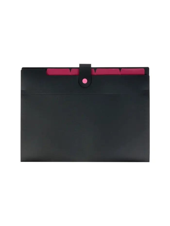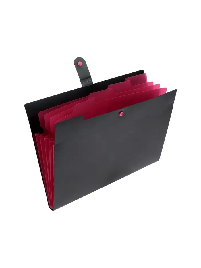 Папка пластиковая на кнопке с отделениями Calligrata формата А4. Обложка матовая, фактура «песок». Цвет обложки - черный. Пять внутренних отделений для удобного хранения и организации документов. Каждое отделение с индексным полем, позволяет сортировать документы по темам или алфавиту. Надежная застежка-кнопка. Контрастный красный цвет отделений. Быстрый доступ к содержимому. Изготовлена из высококачественного полипропилена с матовой текстурой. Предназначена для хранения и транспортировки документов. Толщина обложки 600мкм. Вмещает до 200 листов. Размер 245*325*10. Упакована в индивидуальный прозрачный пакет по форме.