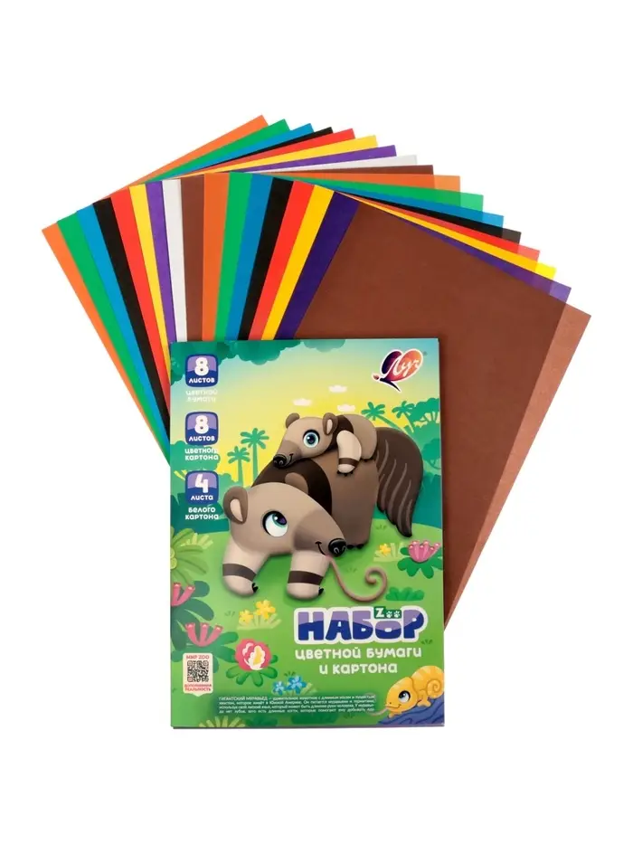 Набор цв бумаги и картона А4 20л (8л цв бумага, 8л, цв картон, 4л бел картон) «Zoo» Муравьед 1096340