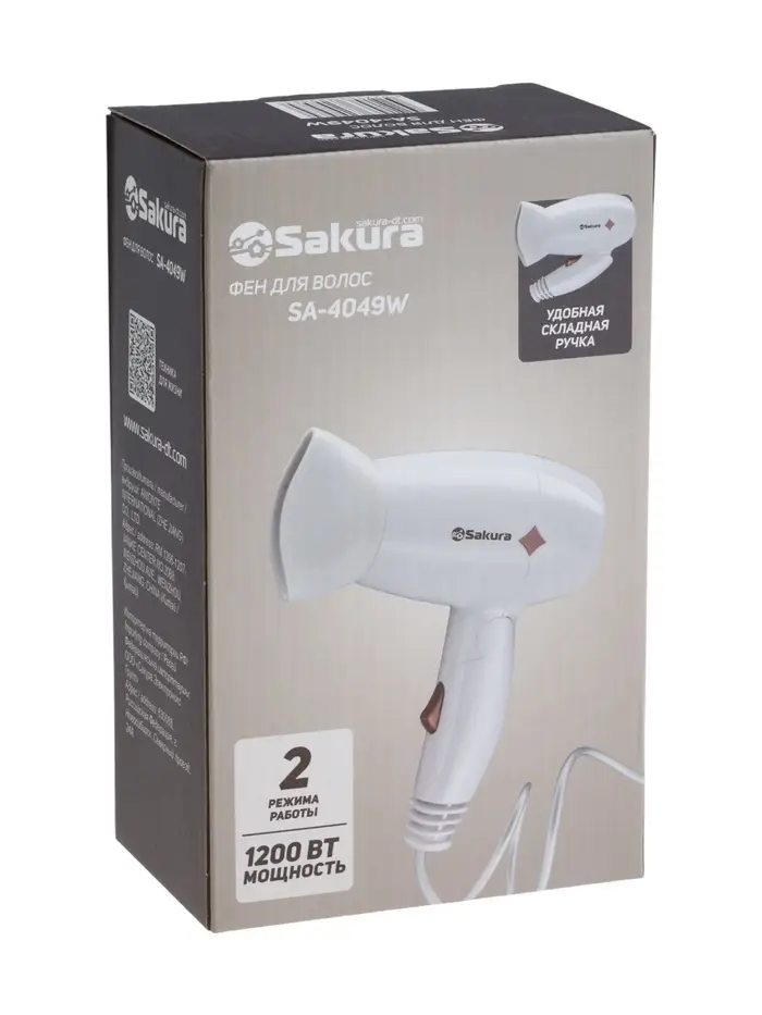 Фен Sakura SA-4049W, 1200 Вт, 2 температурных режима, 2 скорости, белый
