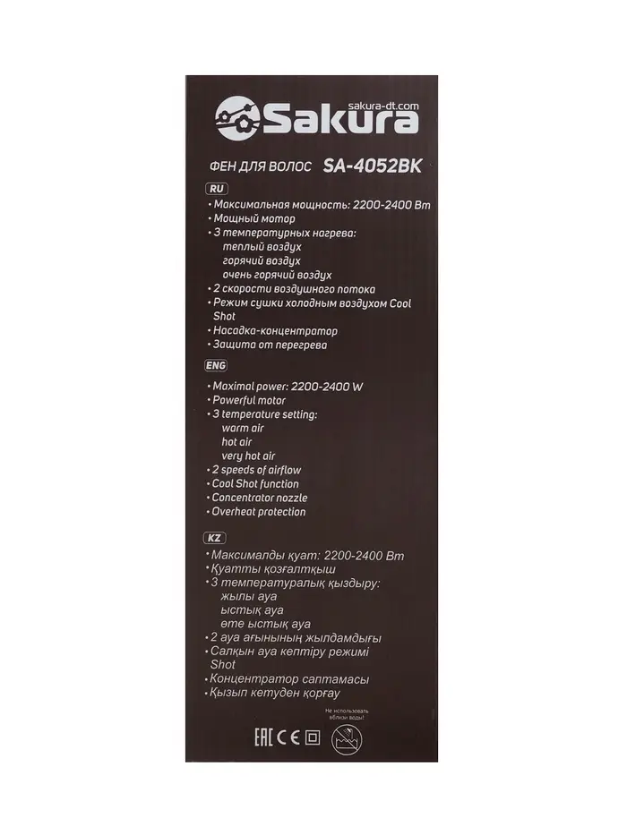 Фен Sakura SA-4052BK, 2400 Вт, 1.8 м, 3 температурных режима, 2 скорости, сушка холодным воздухом