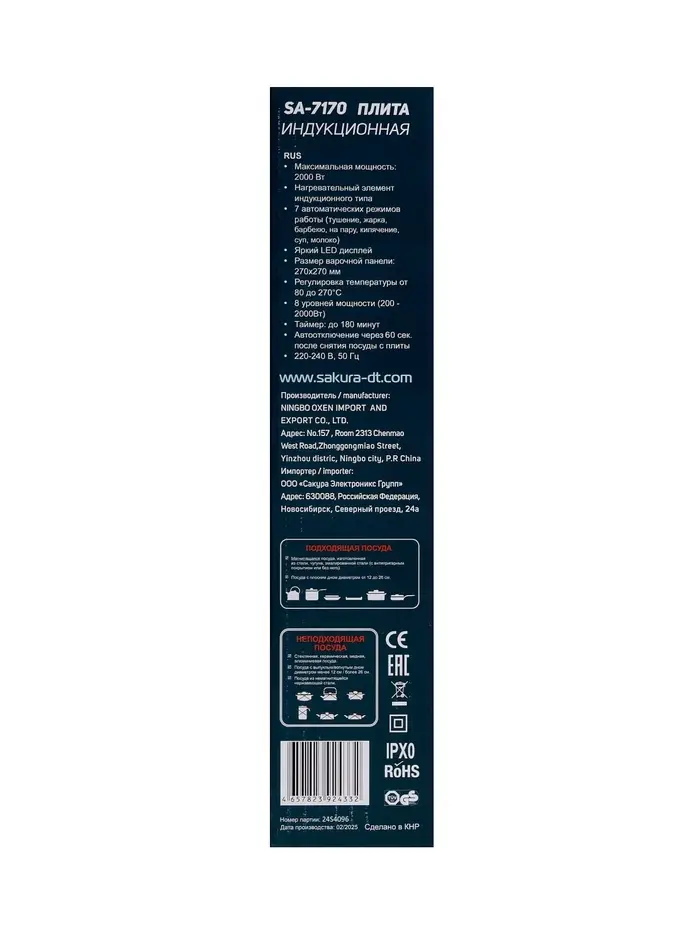 Плитка индукционная Sakura SA-7170, 1 конфорка, 7 авт.программ, 80-270°С, закаленное стекло