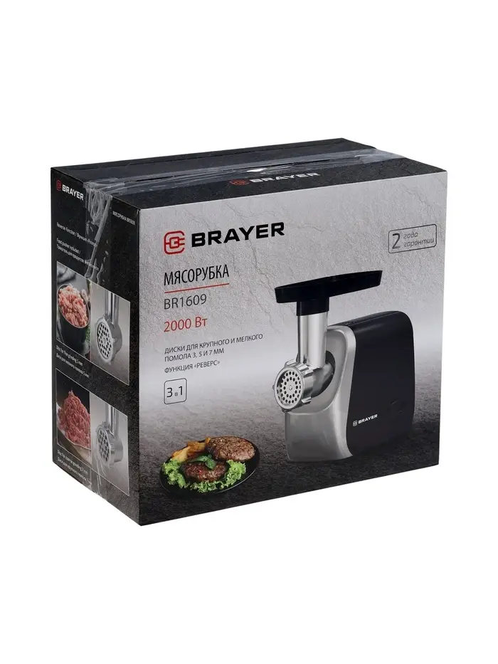 Мясорубка BRAYER 1609BR, электрическая, 2000 Вт, реверс, 3 диска, 3 насадки, 2 кг/мин