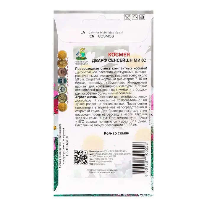 Превосходная смесь компактных космей! Декоративное растение с ажурными сильнорассеченными листьями, высотой всего около 50 см. Соцветия-корзинки диаметром 7-10 см белые, розовые, карминные. Интересный вариант для контейнерной культуры, а также великолепно выглядят на клумбах и в бордюрах, особенно большими массивами.Агротехника. Растение светолюбивое, холодостойкое. К почвам не требовательно, но лучше растет на легких почвах. Посев семян производят в апреле-мае непосредственно в открытый грунт. Для более раннего цветения возможен посев на рассаду в марте. Глубина заделки семян 1 см. При температуре почвы +18 °С всходы появляются через 8-14 дней. Расстояние между растениями 30-35 см.Семена соответствуют требованиям международных стандартов и ГОСТу РФ 12260-81