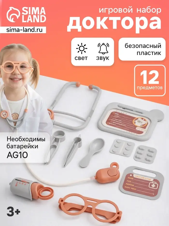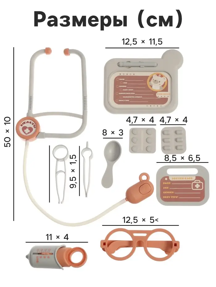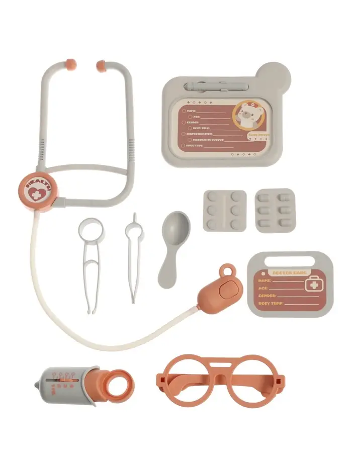 - 10 предметов в комплекте для полноценной игры в доктора;
