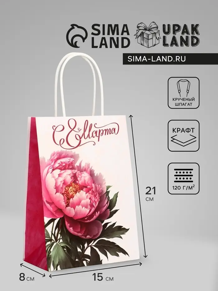 Этот пакет крафт на 8 Марта создан специально для того, чтобы сделать ваш подарок девушке ещё более особенным. Плотность бумаги 120 г/м² гарантирует прочность и надёжность пакета, позволяя безопасно переносить даже хрупкие и ценные вещи.