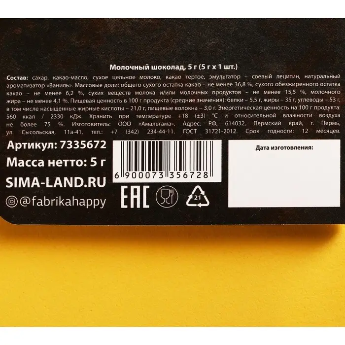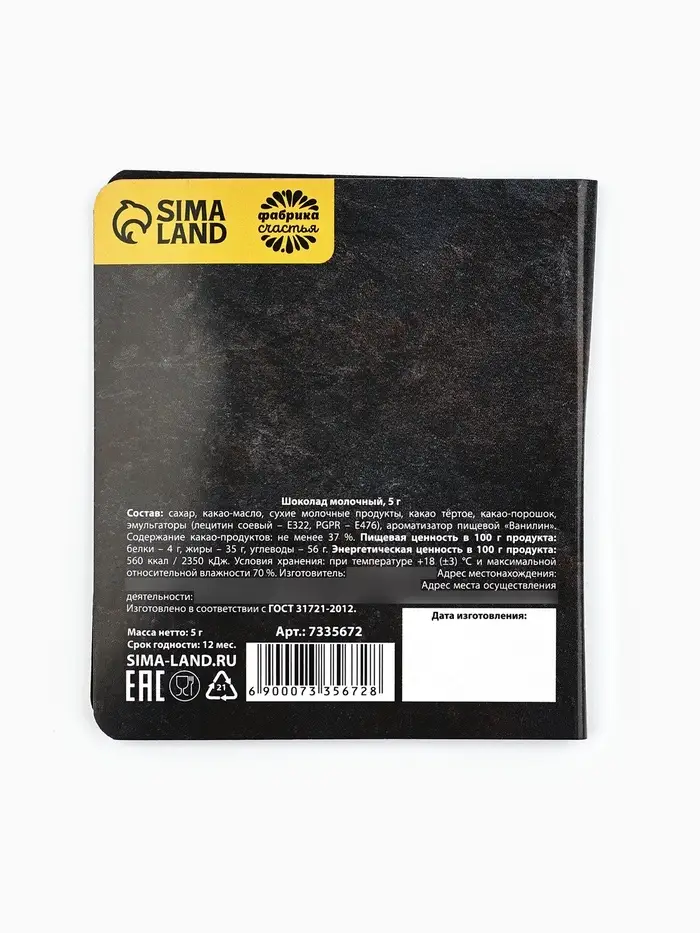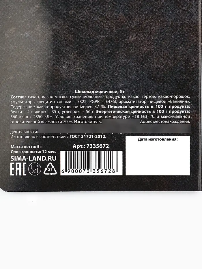 Состав: сахар, какао-масло, сухое цельное молоко, какао тертое, эмульгатор – соевый лецитин, натуральный ароматизатор «Ваниль».