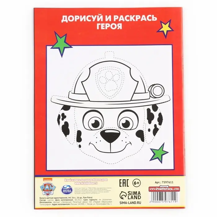 Цветная бумага, А4, 16 листов, 16 цветов, немелованная, односторонняя, на скрепке, 48 г/м², «Щенячий патруль»