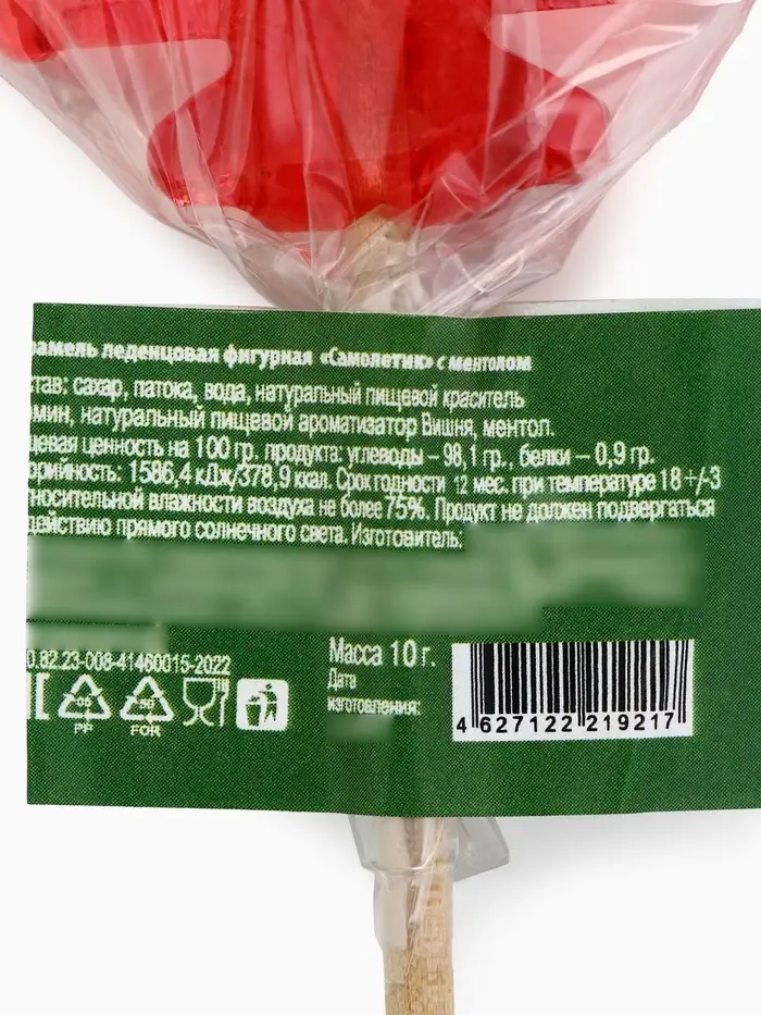 Состав: сахар, патока, вода, натуральный пищевой краситель Кармин, натуральный пищевой ароматизатор Вишня, ментол.
