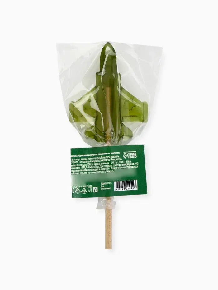 Состав: сахар, патока, вода, натуральный пищевой краситель хлорофилл, натуральный пищевой ароматизатор Мята, ментол.