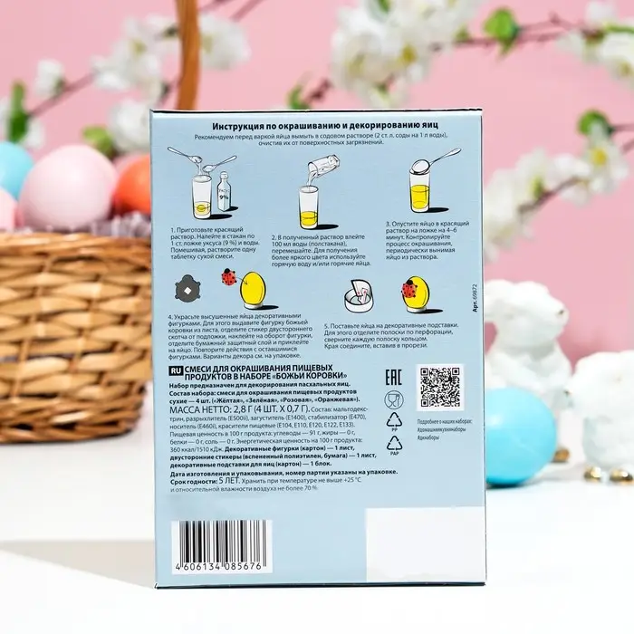 Входящие в набор красители и декоративные материалы позволят легко и просто оформить пасхальные яйца, а картонные заготовки - собрать оригинальные подставки для яиц.
